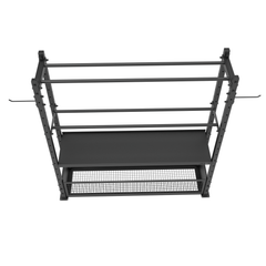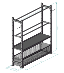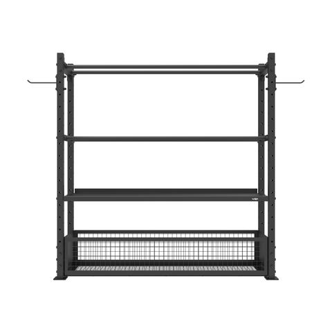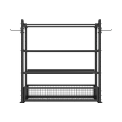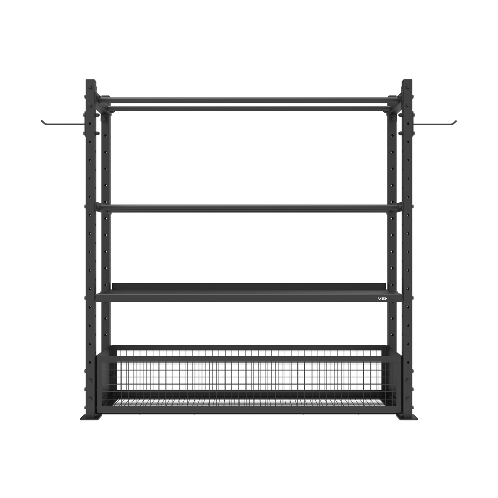 The Venom Commercial Storage Rack is a comprehensive four-tier racking solution engineered for professional training facilities and functional fitness spaces. This versatile system organizes your entire equipment collection with dedicated storage for every item type. The basket shelf accommodates smaller essentials including foam rollers, massage balls, focus pads and boxing gloves, keeping frequently used accessories within easy reach. The heavy-duty shelf provides robust support for kettlebells, dumbbells and other solid, weighted equipment. The dual-pipe top rack securely holds slam balls, wall balls and medicine balls, while integrated storage pegs accommodate power bands, weight belts and skipping ropes. Built from durable 50×50×2mm steel tubing, this rack measures 1830×500×1850mm and comes complete with two wall ball trays, one dumbbell tray, one basket and two hooks—all 450mm wide for consistent spacing and easy access. Perfect for CrossFit boxes, gyms and functional training studios seeking organized, space-efficient equipment storage.