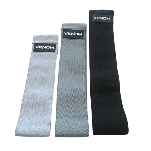 Set of 3 fabric resistance bands by Venom for glute training. Made from an interwoven fabric and rubber mesh, these bands feel great on the skin and won't slip or roll up.
