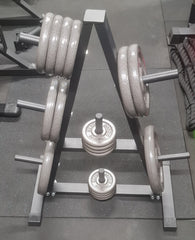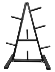 This A frame weight tree is ideal for keeping your training area organised. It holds Standard size weight plates with an inner diameter hole up to 27mm and is made of solid steel rated to hold up to 150kg. It comes with 5 pins on the sides and 2 inner pins, each 15cm long - each able to hold approximately 5-6 plates, depending on how thick they are.